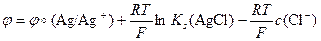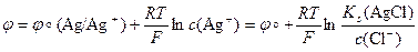 Для вычисления потенциала хлорсеребряного электрода подставим это выражение концентрации Ag+ в уравнение Нернста: