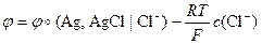 Первые два слагаемых составляют постоянную величину, равную стандартному потенциалу системы (Ag, AgCl|Cl). Объединяя их, получим
