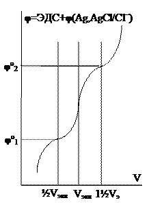 5Fe2+ + MnO4– + 8H+ = 5Fe3+ + Mn2+ + 4H2O Исходный раствор содержит редокс-систему Fe3+/ Fe2+, причем концентрация ионов Fe3+ очень мала, так как это случайная примесь к анализируемому веществу, содержащему ионы Fe2+. Концентрацию Fe2+ примем равной 0,1 моль/л. При малом значении отношения с (Fe3+)/ с (Fe2+) потенциал электрода оказывается низким, что следует из уравнения Нернста. Раствор перманганата калия добавляют небольшими равными порциями, например, по 1 мл. Начинается химическая реакция. Устанавливается определенный потенциал системы Fe3+/ Fe2+. Одновременно в растворе присутствует Mn2+ и в ничтожной концентрации MnO4– , так как реакция обратима. Потенциал определяется соотношением концентраций Fe3+ и Fe2+, и постепенно повышается. Получается так называемая кривая титрования (рисунок). На кривой вблизи точки, где с (Fe3+) = с (Fe2+) (½Vэкв) находится участок замедленного повышения потенциала. Это буферная зона, аналогичная буферной зоне в кислотно-основных буферных растворах. В момент титрования, когда концентрации Fe3+ и Fe2+ становятся одинаковы, потенциал равен стандартному потенциалу. При приближении к точке эквивалентности отношение с (Fe3+)/(Fe2+) быстро увеличивается, и потенциал быстро возрастает. Добавление титранта продолжают. При переходе через точку эквивалентности потенциалопределяющей становится система MnO4–, Н+/Mn2+. Потенциал возрастает сначала быстро. Вблизи точки, где с(MnO4–) = с(Mn2+) рост потенциала замедлен – наблюдается вторая буферная зона.