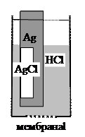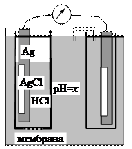 Мембранные электроды конструируются для определения разных ионов, и называются также ионселективными электродами. Принципиальная схема такого электрода показана на рисунке. Он представляет собой хлорсеребряный электрод, в который вмонтирована мембрана. Электрод опускается в изучаемый раствор. На мембране обменивается некоторый вид ионов, в результате чего устанавливается скачок потенциала. Кроме мембранного электрода, в гальваническую цепь входит обычный хлорсеребряный электрод сравнения. Измеряемая ЭДС равна разности электродных потенциалов с добавлением мембранного потенциала. Цепь записывается следующим образом:
