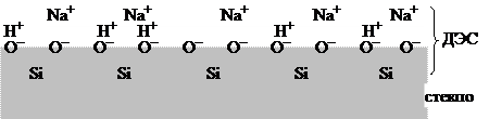 Поверхность стекла в водной среде приобретает отрицательный заряд вследствие диссоциации ионов натрия. Часть их мест занимают ионы водорода из раствора, и оказывается, что остаточный заряд зависит от с (Н+) и, следовательно, от рН.