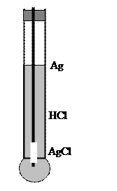 Рассмотрим устройство и принцип работы хлорсеребряного электрода. Твердая фаза в таком электроде состоит из металлического серебра (проволоки) с нанесенным на него хлоридом серебра. Электролитом служит раствор хлорида калия известной концентрации.