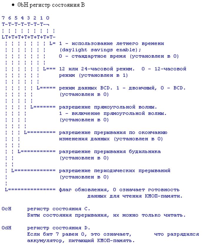 · Прерывание будильника вырабатывается при совпадении регистров часов и регистров будильника и при установленном в 1 бите 5 регистра состояний B.