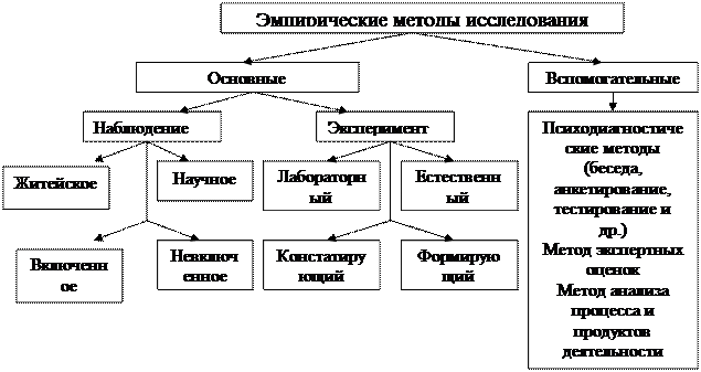 2. Эмпирические методы. Это прежде всего наблюдение и эксперимент, а также психодиагностические методы (беседа, анкетирование, тестирование и др.), метод экспертных оценок, метод анализа процесса и продуктов деятельности, биографический метод.