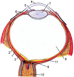 ![]() | Рис.1. Схема строения глаза 1 - склера, 2 - сосудистая оболочка, 3 - сетчатка, 4 - роговица, 5 - радужка, 6 - ресничная мышца, 7 - хрусталик, 8 - стекловидное тело, 9 - диск зрительного нерва, 10 - зрительный нерв, 11 - желтое пятно. |