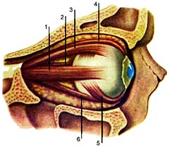 ![]() | Рис.2. Мышцы глаза 1 - наружная прямая; 2 - внутренняя прямая; 3 - верхняя прямая; 4 - мышца, поднимающая верхнее веко; 5 - нижняя косая мышца; 6 - нижняя прямая мышца. |