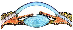 Склера имеет белый цвет с молочным отливом, кроме передней ее части, которая прозрачна и называется роговицей. Через роговицу свет поступает в глаз. Сосудистая оболочка, средний слой, содержит кровеносные сосуды, по которым кровь поступает для питания глаза. Прямо под роговицей сосудистая оболочка переходит в радужную оболочку, которая и определяет цвет глаз. В центре ее находится зрачок. Функция этой оболочки - ограничивать поступление света в глаз при его высокой яркости. Это достигается сужением зрачка при высокой освещенности и расширением - при низкой. За радужной оболочкой расположен хрусталик, похожий на двояковыпуклую линзу, который улавливает свет, когда он проходит через зрачок и фокусирует его на сетчатке. Вокруг хрусталика сосудистая оболочка образует ресничное тело, в котором заложена мышца, регулирующая кривизну хрусталика, что обеспечивает ясное и четкое видение разноудаленных предметов. Достигается это следующим образом (рис.3).