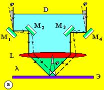 Угловое расстояние между соседними интерференционными максимумами q = l / D (рис. 10, б).