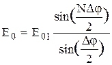 Рассмотрим случай равных амплитуд. Разность фаз двух соседних источников отличается на одно и то же значение Dj = const.
