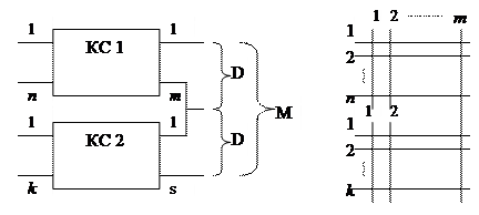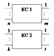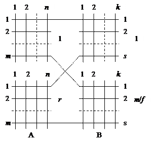 | n – число входов матрицы звена А; r – число матриц звена А; m – число промежуточных линий между звеньями Аи В; s – количество входов в матрицу звена В; k – число выходов из матрицы звена В; f – связанность. |