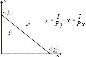 Потребитель стремится приобрести товарный набор, принадлежащий наиболее удаленной от начала координат кривой безразличия, т.к. она представляет более предпочтительные наборы. Но потребитель ограничен в своих средствах, и далеко не всякий товарный набор ему доступен. Предположим, что потребитель тратит весь свой доход I на приобретение только двух товаров х и у, тогда бюджетное ограничение потребителя можно записать в виде: