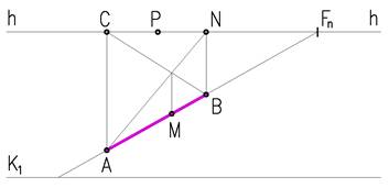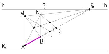 На горизонтальной прямой необходимо отложить отрезки ВС и СD, равные заданному отрезку АВ (рис. 2). На АВ строим произвольный прямоугольник AMNB. Проводим диагонали и из точки пересечения диагоналей проводим прямую в точку схода Fn. Она разделит сторону ВN пополам в точке О. Проведя прямую МО до пересечения с АВ определим т. С. При этом ВС будет равно по длине АВ. Аналогично получим т. D.