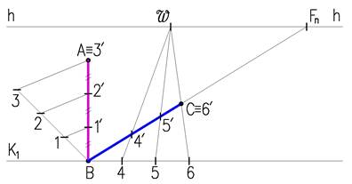 Дан вертикальный отрезок АВ и горизонтальный ВС. Необходимо разделить АВ и ВС на три равные части (рис.3). Т.к. отрезок АВ параллелен картине, то деление осуществляется так же, как в ортогональных проекциях. Под произвольным углом проводим прямую и откладываем на ней 3 равных отрезка. Конец отрезка (т.3), соединяем с точкой А. Через точки деления 1 и 2 проводим ряд прямых параллельных 3А, которые разделяют отрезок АВ на