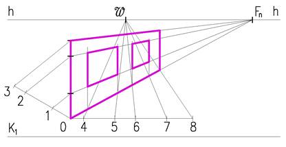 г) деление отрезка на произвольное число не равных частей (пропорциональное деление). Дана ортогональная проекция стены здания с окнами и перспектива стены (рис. 4). Необходимо нанести окна на плоскость стены в перспективе.