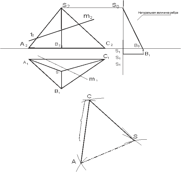 Определяем натуральные величины ребер основания методом плоско-параллельного перемещения. Построение развертки начинаем с грани ВSС. Для того чтобы нанести на развертку точки пресечения пирамиды с прямой, строим на развертке линию пересечения 1-2-3.
