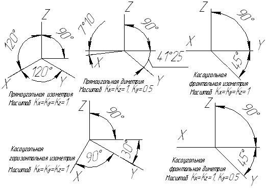 Не всякое положение координатных осей придает наглядность изображению и легко может быть построено. Практика работы с наглядными изображениями из бесконечного множества возможных аксонометрических изображений выделила пять основных ее видов, которые стандарты Единой Системы Конструкторской Документации (ЕСКД) разрешают для использования в чертежах. (Рис.3). Выбор вида аксонометрии зависит от формы изображаемой детали, так вертикальный цилиндр, обычно, изображают в прямоугольной изометрии, а горизонтальный- во фронтальной косоугольной изометрии.