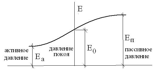 Взаимодействие ограждающей конструкции с массивом грунта имеет сложный характер и зависит от жесткости конструкции, от ее смещений и прогибов. При абсолютно неподвижном состоянии массива грунта за подпорной стеной реализуется так называемое давление покоя. При смещении стены от массива грунта за подпорной стеной реализуется активное давление. При движении стены на удерживаемый ею массив грунта в нем реализуется пассивное давление. Графически эти три вида давления представляются в виде зависимости