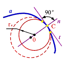 В рассматриваемой точке кривая и соприкасающаяся с ней окружность имеют общие касательную и нормаль.
