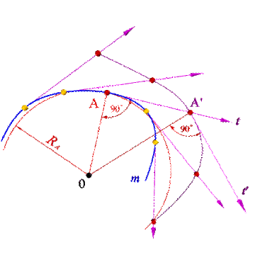 4. Точке А заданной кривой соответствует точка A' построенной кривой. Проводим нормали к кривым в точках A и A'.