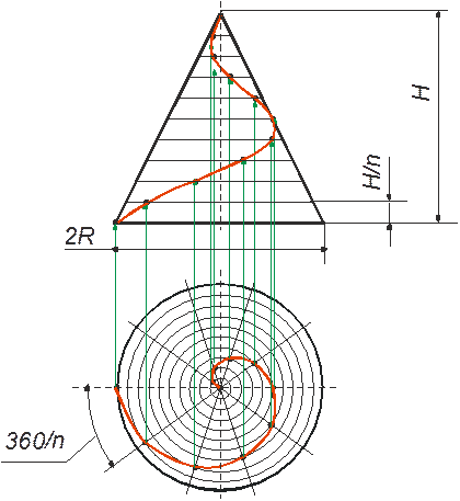 Такую линию описывает точка, которая движется по какой-либо образующей прямого кругового конуса, вращающегося вокруг своей оси так, что путь, пройденный точкой по образующей, все время равен углу поворота конуса.
