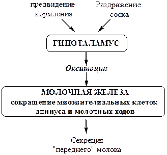Первичным ответом на сосание является выделение окситоцина, который стимулирует сокращение миоэпителиальных клеток молочных желез и выделение «переднего» молока, бедного белками и липидами (мерокринная секреция).