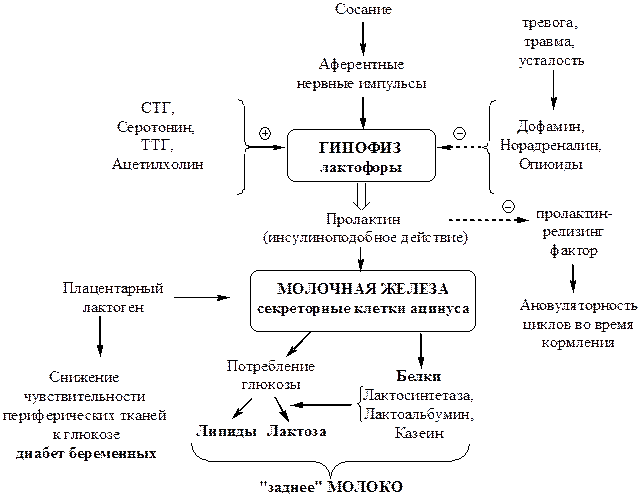 Лактогенез наступает после родов. При отторжении плаценты происходит снижение в крови матери концентрации эстрогенов и прогестерона, которые ингибировали через гипоталамус молочную железу. Резко возрастает активность пролактина, достигая максимума в течение 24-48 часов после родов.