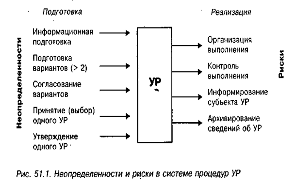 Руководителям различного уровня нередко приходится готовить УР в условиях недостаточной или ненадежной информации, большой текучести кадров, недобросовестности поставщиков или покупателей, частых изменений законодательства, конъюнктуры рынка и др. В процессе реализации УР также возможны непредвиденные ситуации, затрудняющие точное его выполнение. Таким образом, для УР характерны неопределенность и риск.