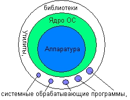 Вычислительную систему, работающую под управлением ОС на основе ядра, можно рассматривать как систему, состоящую из трех иерархически расположенных слоев: нижний слой образует аппаратура, промежуточный — ядро, а утилиты, обрабатывающие программы и приложения, составляют верхний слой системы (рис. 3.6). Слоистую структуру вычислительной системы принято изображать в виде системы концентрических окружностей, иллюстрируя тот факт, что каждый слой может взаимодействовать только со смежными слоями. Действительно, при такой организации ОС приложения не могут непосредственно взаимодействовать с аппаратурой, а только через слой ядра.