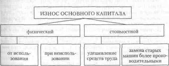 Особую заботу предприниматели проявляют о сохранении и возмещении стоимости основного капитала, который по своей экономической природе относится к постоянно возобновляемому капиталу. Такое непрерывное восстановление стоимости средств труда производится по определенным нормам в соответствии с их износом. Этот износ бывает двояким: физическим и стоимостным (моральным) (рис. 9.2).