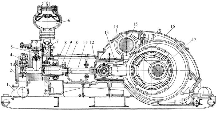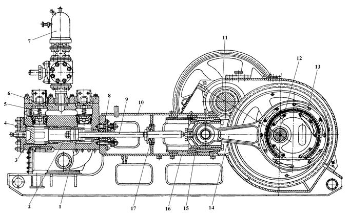 1 – поршень; 2 – цилиндровая втулка; 3 – крышка цилиндра; 4 – упорный стакан; 5 – нагнетательный клапан; 6 – корпус клапанной коробки; 7 – пневмокомпенсатор; 8 – сальниковое уплотнение штока; 9 – шток; 10 – корпус насоса; 11 – трансмиссионный вал; 12 – коренной вал; 13 – ведомая головка шатуна (эксцентрик); 14 – шатун; 15 – крейцкопф; 16 – направляющие крейцкопфа; 17 – надставка штока.