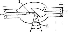 Трубка представляет собой вакуумированную стеклянную колбу (давление воздуха в ней порядка 10–6 мм.рт.ст.) с двумя электродами: анодом А и катодом К, к которым приложено высокое постоянное напряжение U (в рентгенологии – 15 - 150 кВ в зависимости от цели исследования). Катод является источником электронов (за счет явления термоэлектронной эмиссии). Анод – металлический стержень, имеет наклонную поверхность для того, чтобы направлять возникающее рентгеновское излучение под углом к оси трубки, вдоль которой к аноду движутся электроны. Он изготовляется из хорошо теплопроводящего материала для отвода теплоты, образующейся при его бомбардировке электронами. На скошенном торце имеется пластинка из тугоплавкого металла (например, вольфрама). Именно при взаимодействии электронов с атомами вещества этой пластинки и возникает R-излучение.