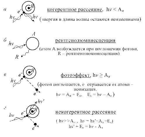 Рентгеновское излучение в веществе поглощается и рассеивается. При этом могут происходить различные процессы, которые определяются соотношением энергии рентгеновского фотона h