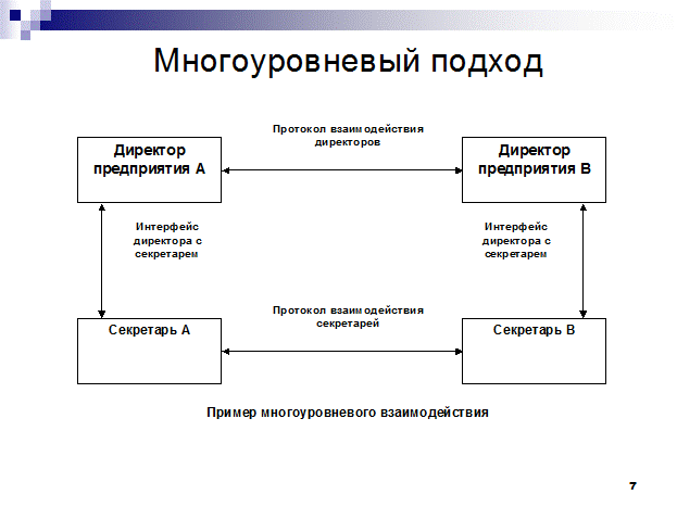 Есть 2 предприятия А и В, связанные каким-либо деловым сотрудничеством. Между предприятиями существуют многочисленные договоренности и соглашения, например регулярные поставки продукции одного предприятия другому. Начальник предприятия А регулярно (каждый месяц) посылает официальное сообщение начальнику предприятия В о том, сколько и чего доступно на складе. В ответ, начальник В посылает заявку сколько и чего нужно. Это и есть установленный порядок взаимодействия, который называется протокол. В данном случае – протокол уровня начальников. Начальники посылают свои заявки не сами, а через своих секретарей. Порядок взаимодействия начальника и секретара –это межуровневый интерфейс. Например, на предприятии А обмен идет по электронной почте, а на предприятии В начальник общается с секретарем по телефону. Т.е., интерфейсы начальник-секретарь отличаются. После того, как сообщения переданы секретарям, начальников не волнует, как эти сообщения будут переданы дальше. Это может быть почта, факс, курьер и т.д. Выбор способа передачи – это компетенция секретарей, они решают этот вопрос не уведомляя начальников и связываясь только между собой. Это протокол взаимодействия секретарей. При решении других вопросов начальники могут общаться по другим протоколам-правилам и это не повлияет на работу секретарей, для которых не важно, что отправлять, а важно, чтобы сообщения дошли до адресата. Мы имеем дело с двумя уровнями – уровнем начальников и уровнем секретарей и каждый из них имеет собственный протокол, который может быть изменен независимо от протокола другого уровня. Эта независимость протоколов и есть основное достоинство многоуровневого подхода.