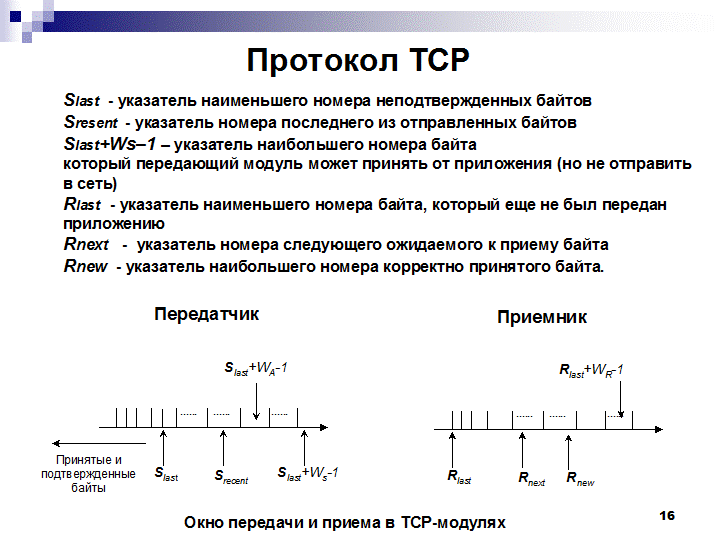 · Slast+Ws–1 – указатель наибольшего номера байта, который передающий модуль может принять от приложения (но не отправить в сеть).