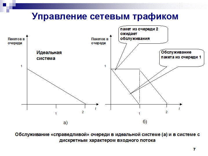 Если же обслуживание очередей организовано на «пакетном» принципе (рис. б), то пакет из первой очереди будет обслужен за 1 секунду, а из второй – через 2 секунды («несправедливость» стала еще большей). Естественно, усредненная «несправедливость» будет тем меньше, чем больше пакетов будет обслужено из каждой очереди.