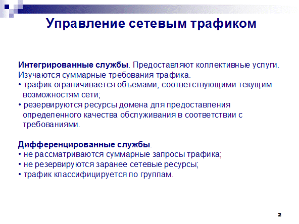 Т.е., можно сказать, что интегрированные услуги (т.е. совмещенные услуги) – это работа всей сети, которая анализирует свое состояние и рассматривает суммарные запросы, а дифференцированные услуги (раздельные) – предоставляются на основании информации внутри трафика (приоритеты и т.д.)