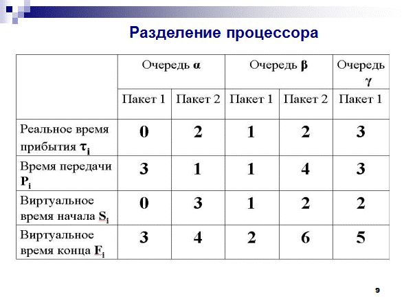 Следующее рекуррентное соотношение показывает, как система разделения процессора развивается в виртуальном времени: это виртуальные времена завершения передачи пакета и начала передачи.