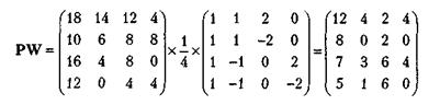 Первый шаг двумерного волнового преобразования Хаара состоит из одномерного преобразования каждого ряда, осуществляемого путем умножения матриц PW, для чего используется версия 4x4 матрицы W, определенной в предыдущем подразделе: