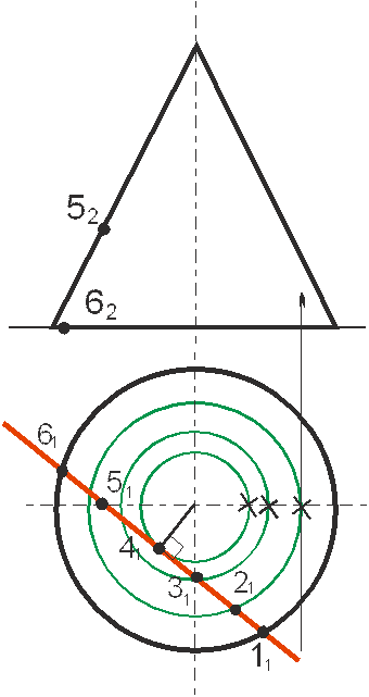 Рассмотрим сечение конуса горизонтально-проецирующей плоскостью (рис.4). На горизонтальной плоскости проекций линия пересечения определена, чтобы построить вторую проекцию этой линии пересечения, обозначим основные (1, 4 и 6) и вспомогательные точки (3, 2). Точки 6 и 1 принадлежат основанию конуса их вторые проекции построить легко. Точка 5 принадлежит очерковой образующей и является границей видимости кривой на фронтальной проекции, ее построение не представляет трудности. Вершина кривой это точка (4), которая находится ближе всего к вершине конуса (в предыдущей задачи она определялась на фронтальной проекции), то есть на перпендикуляре, опущенном из вершины конуса. Точки 3 и 2 являются вспомогательными. Для построения точек 4, 3 и 2 воспользуемся параллелями. Чтобы построить фронтальные проекции параллелей обозначим их пересечение с очерковой образующей крестиками и перенесем их на фронтальную проекцию образующей. После того как будут построены все проекции точек, соединим их плавной линией, при этом участок 6-5 будет невидимым, поэтому его следует провести пунктирной линией. Полученная кривая имеет форму гиперболы.