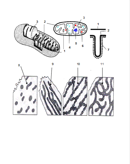 1 – наружная; 2 – внутренняя митохондриальная мембраны; 3 – матрикс;4 – митохондриальные рибосомы; 5 – мит-ДНК; 6 – включения (гликоген, соли тяжелых металлов, пигменты); 7 – АТФ-синтазный комплекс; 8 – одиночные митохондрии; 9 – нитчатые; 10 – цепочечные; 11 – ретикулярные (сетчатые)