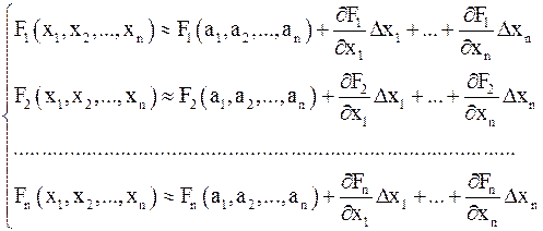 в ряд Тейлора, причем члены, содержащие вторые производные (и производные более высоких порядков), отбрасываются. Пусть приближенные значения неизвестных системы (например, полученные на предыдущей итерации) равны соответственно