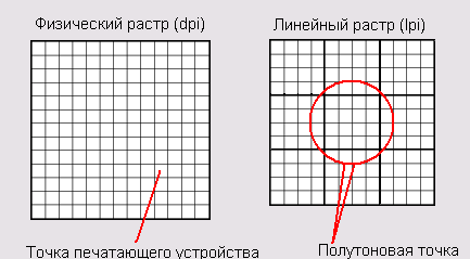 Соседние точки физической сетки печатающего устройства объединяются в прямоугольники, которые называются полутоновыми ячейками (halftone cells). Из полутоновых ячеек образуется еще одна сетка, именуемая линейным растром (line screen). Линейный растр — это просто способ логической организации физического растра.