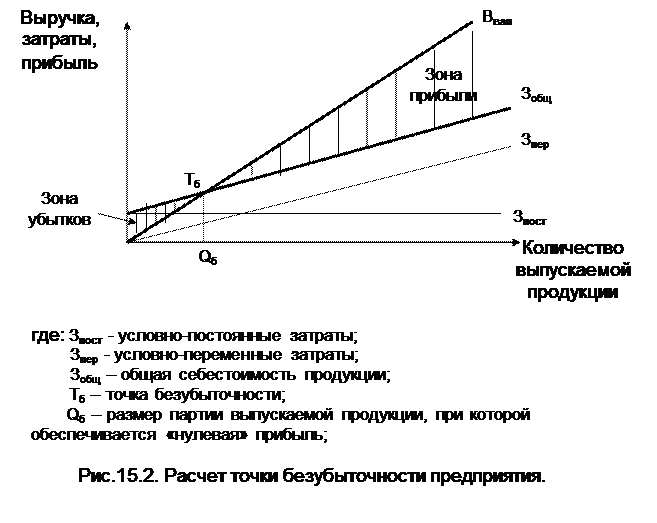 При расчете прибыли и рационального размера организации следует определять точку безубыточности. Точка безубыточности – это минимальный размер партии выпускаемой продукции, при котором обеспечивается «нулевая прибыль», т.е. доход от продажи равен издержкам производства, рис.15.2: