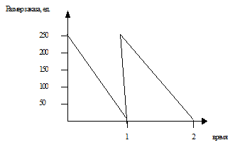 Текущие расходы на содержание запасов определяются в расчете на среднюю стоимость в рублях 250 ед. В этом случае расходы на оформление заказов возникают всего один раз в год. Однако если бы заказы делались два раза в год, то тогда первоначальный заказ падал бы до нуля и снова возрастал до 250 ед.