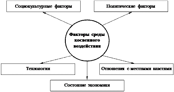Различным будет и влияние конкретных факторов среды косвенного воздействия. Общей предпосылкой эффективного международного бизнеса является политическая ситуация в стране, где организация осуществляет свои операции. Существенное влияние на международный бизнес оказывают состояние экономики, развитие технологий. В ряде случаев, например при экспорте определенных потребительских товаров, решающую роль могут сыграть социокультурные факторы. При размещении новых производств необходимо добиваться поддержки местных властей.