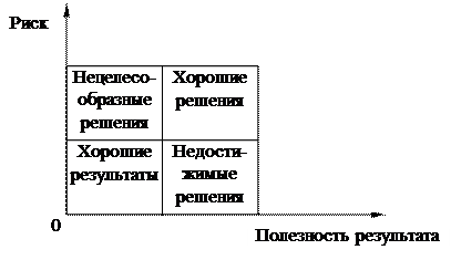 Вторая альтернатива почти гарантирует довольно значительные потери при выходе на новый для фирмы рынок. Риск при реализации этой стратегии достаточно велик. Однако полезность второй стратегии значительно выше, чем первой. Это хорошее решение. Таким образом, хорошее решение приводит к плохому результату, а плохое решение – к хорошему результату (рис. 33). Выбор решения зависит от личности ЛПР, его отношения к риску, способности организации отличать хорошие решения от хороших результатов, а также от принятых в организации критериев оценки деятельности менеджеров.