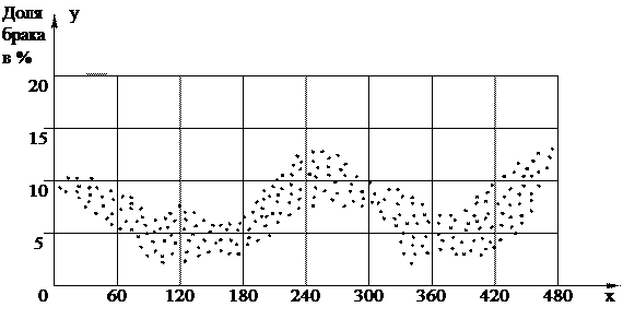 Построение диаграммы рассеивания – быстрый и простой метод установления наличия связи между двумя множествами данных. Например, на этапе сбора данных собрана информация о времени изготовления детали и ее соответствии требованиям качества. Нанесение соответствующих значений на график, у которого время изготовления детали на одной оси (Х) и долей бракованных деталей на другой оси (У), поможет выявить существование такой связи между указанными множествами и ее характер. На рисунке 45 приведен пример подобного графика. Наибольшая доля брака приходится на периоды в начале и конце рабочей смены, а также непосредственно после перерыва. Наиболее качественные детали изготавливаются в середине рабочих интервалов.