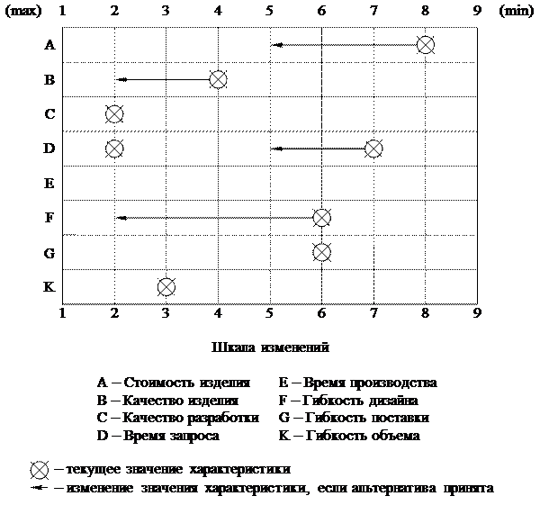 Рисунок 65 поясняет, как эта шкала может использоваться для оценки изменений ряда характеристик при принятии конкретной альтернативы.