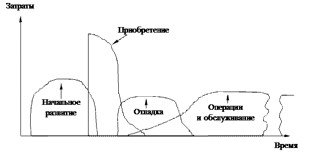 Например, компания оценивает приобретение одного из двух типов копировальных аппаратов. Один из аппаратов значительно дешевле – его приобретение кажется на первый взгляд предпочтительнее. Но какие другие затраты должна рассматривать компания кроме первоначальной стоимости? Каждый из аппаратов требовал бы затрат на транспортировку, установку, наладку еще до начала эксплуатации. В течение периода эксплуатации компания будет нести издержки по эксплуатации и техническому обслуживанию, текущему ремонту. Эти и другие затраты зависят от первоначального выбора копировального аппарата. Необходимо учесть и ликвидационную стоимость аппарата, что также может повлиять на выбор типа аппарата. Рисунок 66 показывает затраты компании в течение жизненного цикла аппарата.