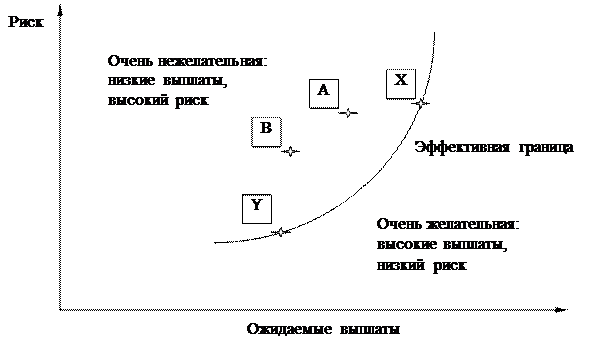 Левая верхняя часть диаграммы представляет нежелательную область, где альтернативы имеют низкие ожидаемые выплаты, но высокие риски. Нижняя правая часть диаграммы содержит чрезвычайно привлекательные альтернативы, которые дают высокие выплаты и включают небольшой риск. Между этими двумя экстремумами найдется линия, представляющая комбинации риска и лучших выплат, на которые можно надеяться в конкретном решении. Выборы X и Y содержатся в этом наборе, иногда называемом эффективной границей. Любой выбор, который помещен на линию, называется доминирующим над любым другим выбором, который находится в левой верхней части диаграммы. Таким образом, выбор X доминирует над выбором А (X дает лучшие выплаты при том же самом риске) и выбор Y доминирует над выбором B (Y дает те же выплаты при меньшем риске).